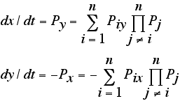 where not all of the Ai's are equal, then it is easy to see that P(x,y) = 0 is a solution to the new system, that is, the n components of P are among the solution curves to equations (1) and (2). Equations (1) and (2) constitute the least complex (lowest degree) nontrivial system for which P(x,y) = 0 is a solution. I call the system of equations given by (1) and (2) the master equation. Flows given by the master equation are generated by P(x,y). The irreducible components of P(x,y) are called the generators of the flow.