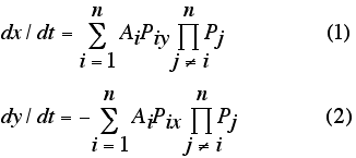 It should be noted that in the more general case where P(x,y) is not algebraic, the components of P(x,y) are still solutions to equations (1) and (2). Furthermore, when all of the Ais equal 1, equations (1) and (2) become a Hamiltonian system.